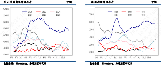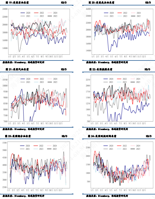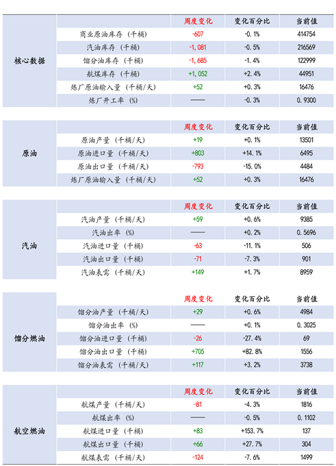 当周原油产量微增1.9万桶/日至1350.1万桶/日,保持高位平稳运行。贝克休斯钻井数小幅增加2口,显示目前生产意愿稳定。原油进口环比大增80.3万桶/日,出口减少79.3万桶/日,净进口显著增加。