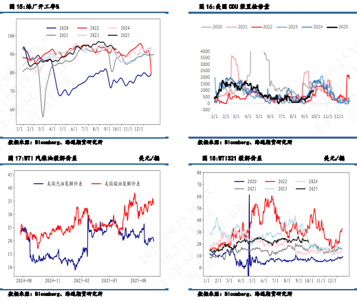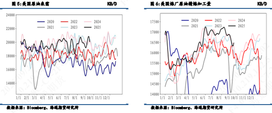 需求方面,美国原油表需有小幅下行,但仍高于历史同期平均水平。同时,炼厂角度的加工量环比也有明显下降,整体需求端支撑边际有所减弱。