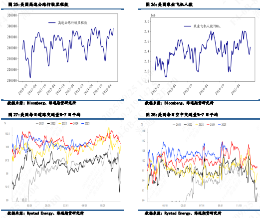 2.终端消费 从终端数据来看,道路交通量变化没有空中交通量大。从美国每日空中交通量数据来看,七日移动平均值在9月中旬降至2024年水平以下。总体而言,当前数值较2024年同期低3%。其中,国内旅行量下降3%,国际旅行量同比下滑6%。国际航线中美加航线受影响最为严重,较2024年水平降低5%,美欧航线则下降3%。这些趋势可能预示着美国作为旅行目的地的整体吸引力正在减弱。目前尚无明确证据表明出行需求从国际转向国内,因为国内旅行量同样呈现下降态势。