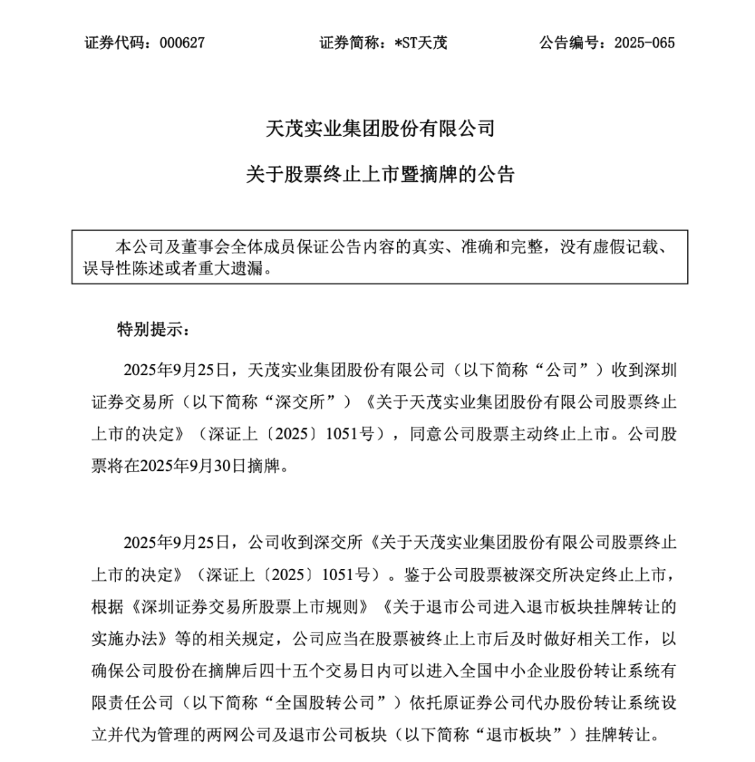 *ST天茂(000627)9月28日公告,9月25日公司收到深交所《关于天茂实业集团股份有限公司股票终止上市的决定》,同意公司股票主动终止上市。公司股票将在2025年9月30日摘牌。