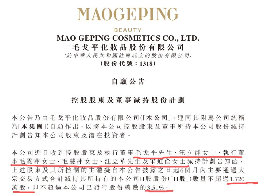 公司指,上述股东因自身财务需求拟减持其所持有的部分股份,减持所得款项用途包括但不限于美妆相关产业链的投资、改善个人生活等。连同内资股及H股,毛戈平、毛霓萍、毛慧萍合共持有3.13亿股,占总股本63.8%。